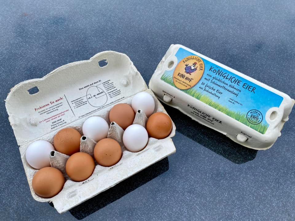 Was hier natürlich nicht fehlen darf: Unsere königlichen, frischen Eier in verschiedenen Größen und Farben von glücklichen Hühnern mit Schönwetterauslauf.